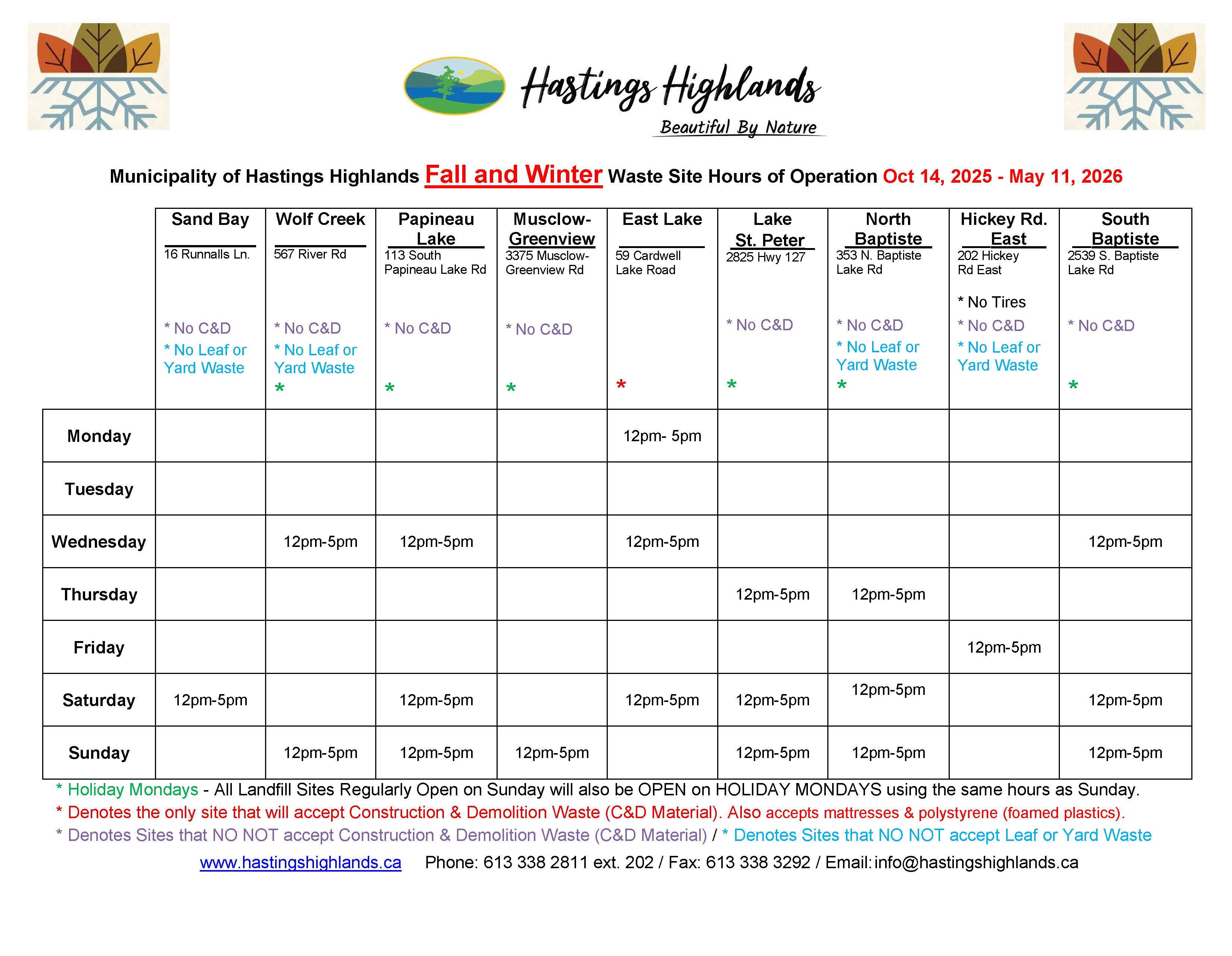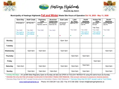 The Municipality of Hastings Highlands has nine (9) Waste Disposal/Transfer Sites located throughout the Municipality for the disposal of your waste and recycling.
