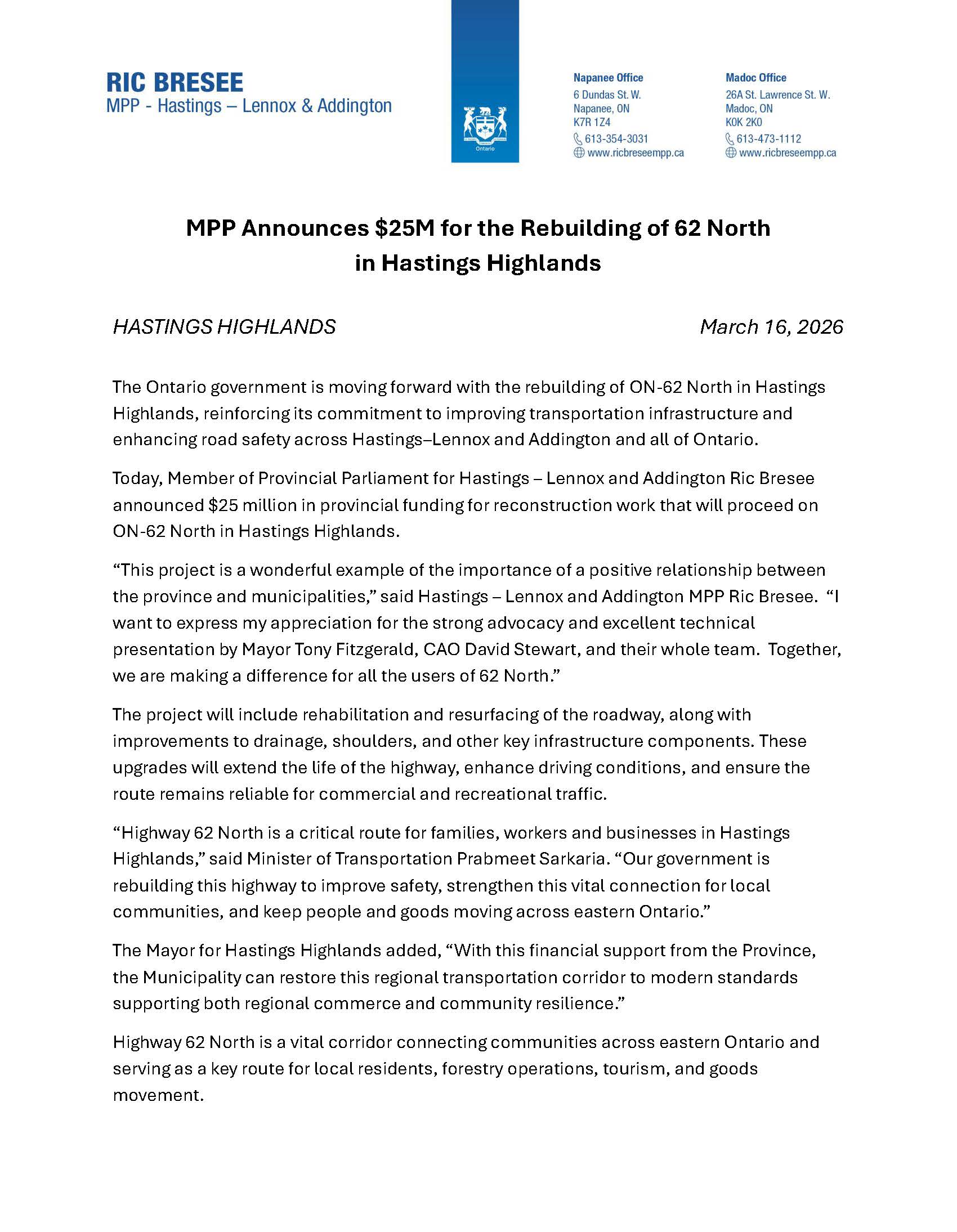 Today, Member of Provincial Parliament for Hastings – Lennox and Addington Ric Bresee announced $25 million in provincial funding for reconstruction work that will proceed on ON-62 North in Hastings Highlands.