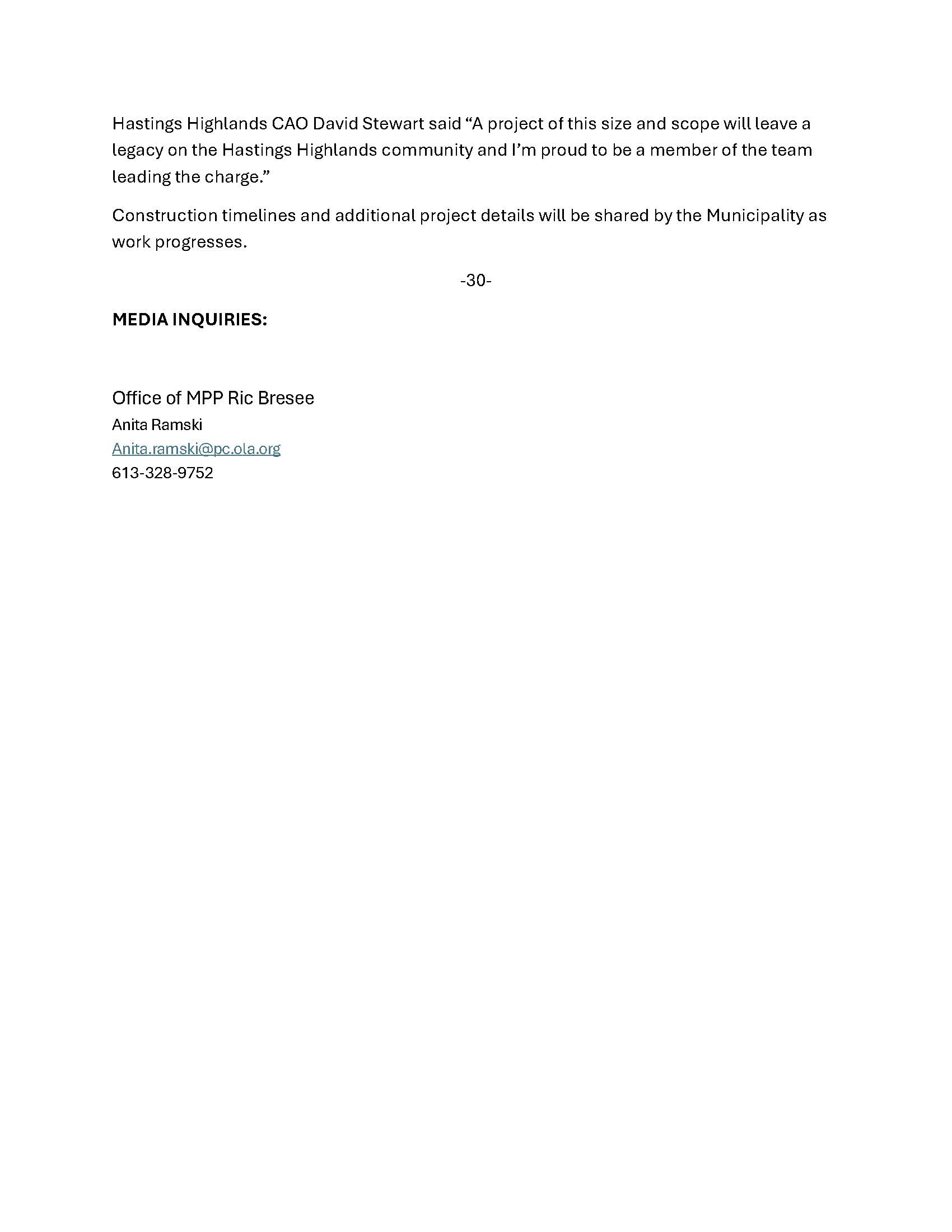 2026 Media Release - MPP Ric Bresee Announces $25M for Hastings Highlands Infrastructure Project