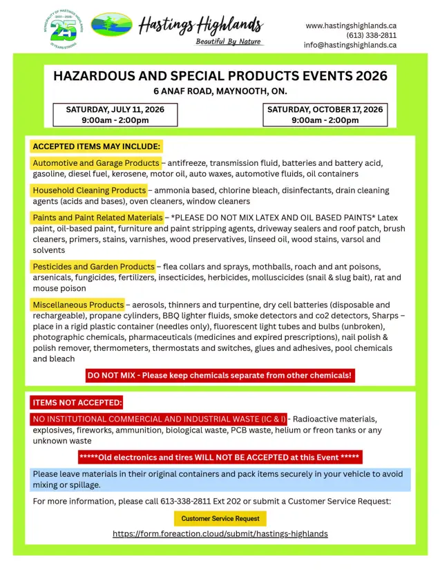 Hastings Highlands 2026 Hazardous Waste Events Schedule